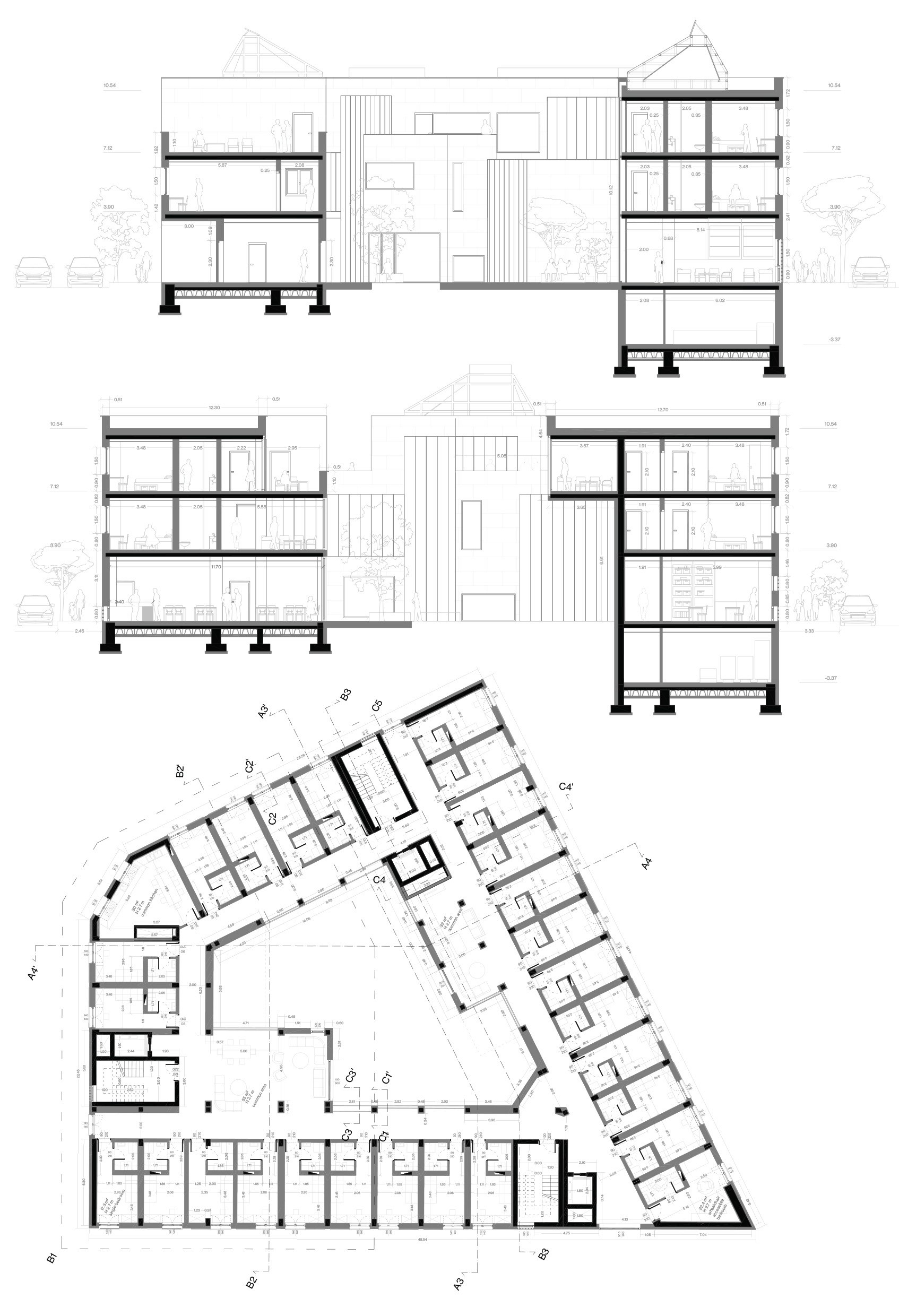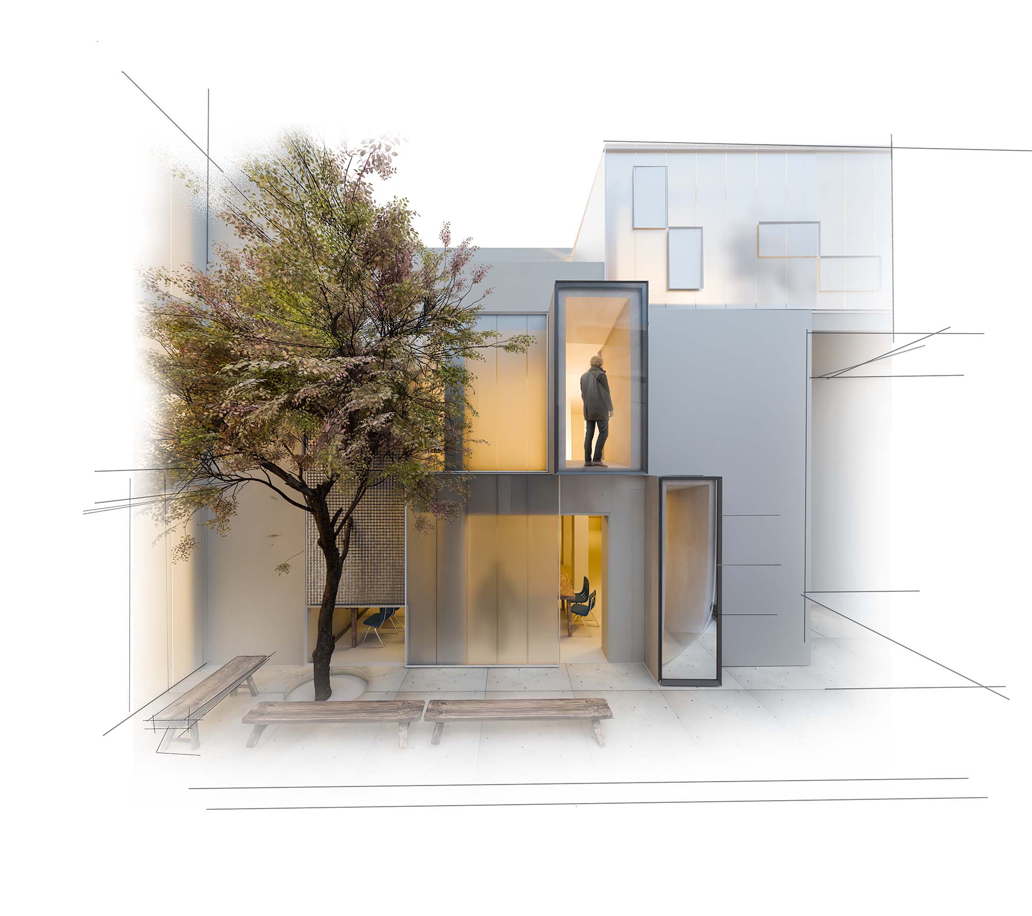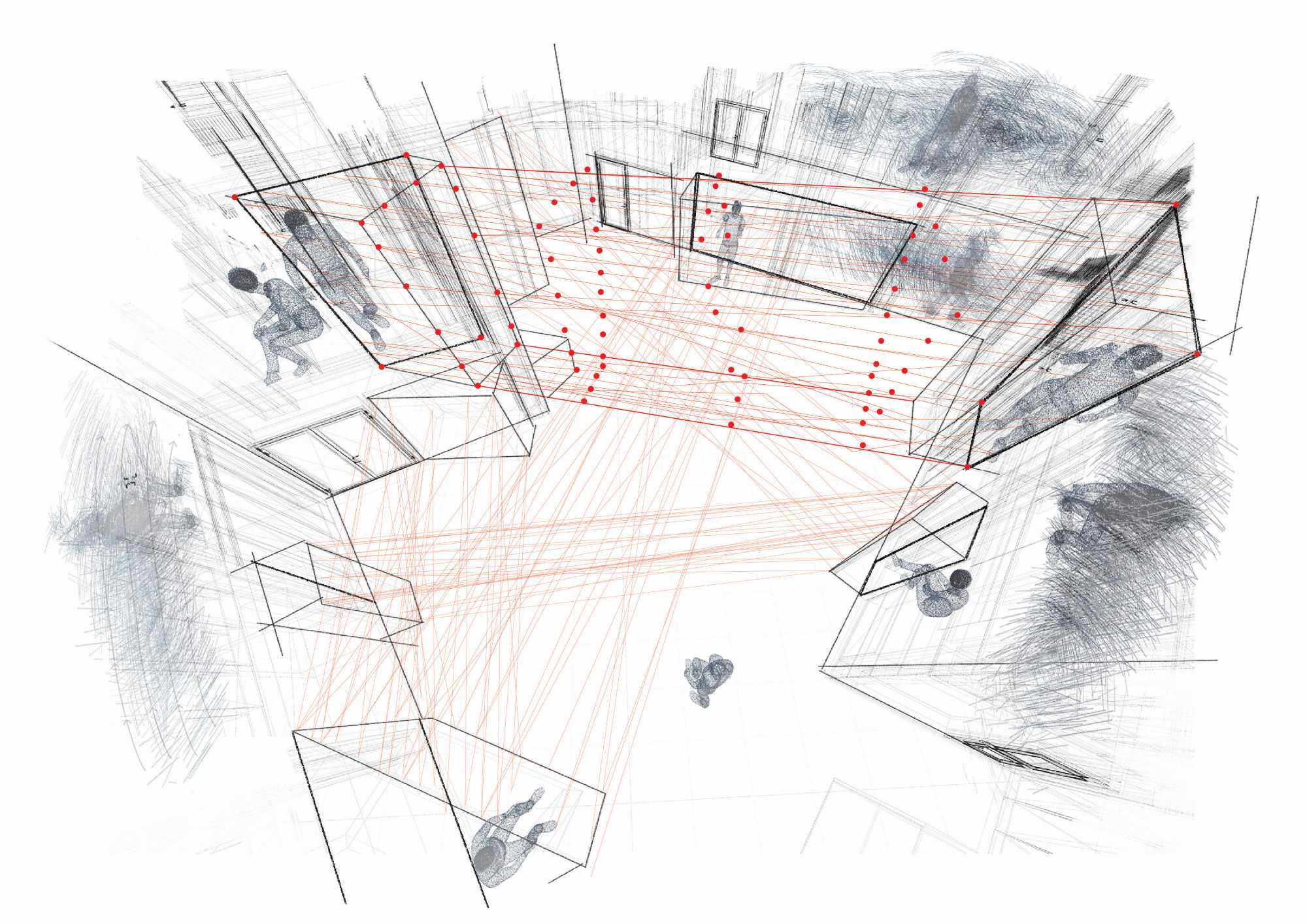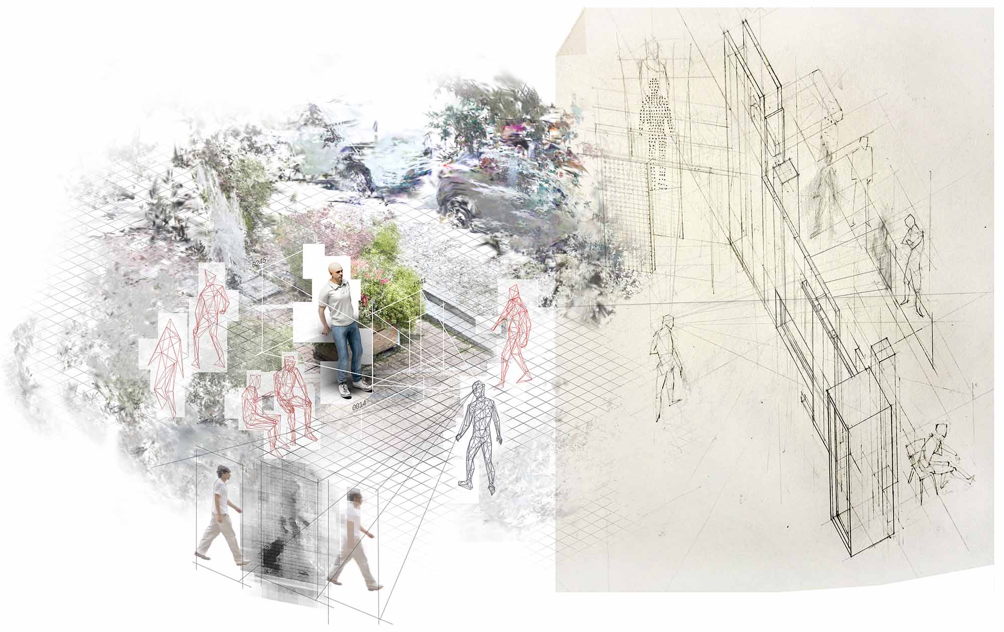 Student housings run the risk of being chaotic, noisy & hectic environments. This project creates spaces where the presence of a community is felt, but in way that is not overwhelming. The movement of people is visually broken down into blurs & gestures that our peripheral vision picks up on. Digital methods were used to explore this idea of selectively downscaling the "resolution" of our vision to free up our brains' "computing" power.