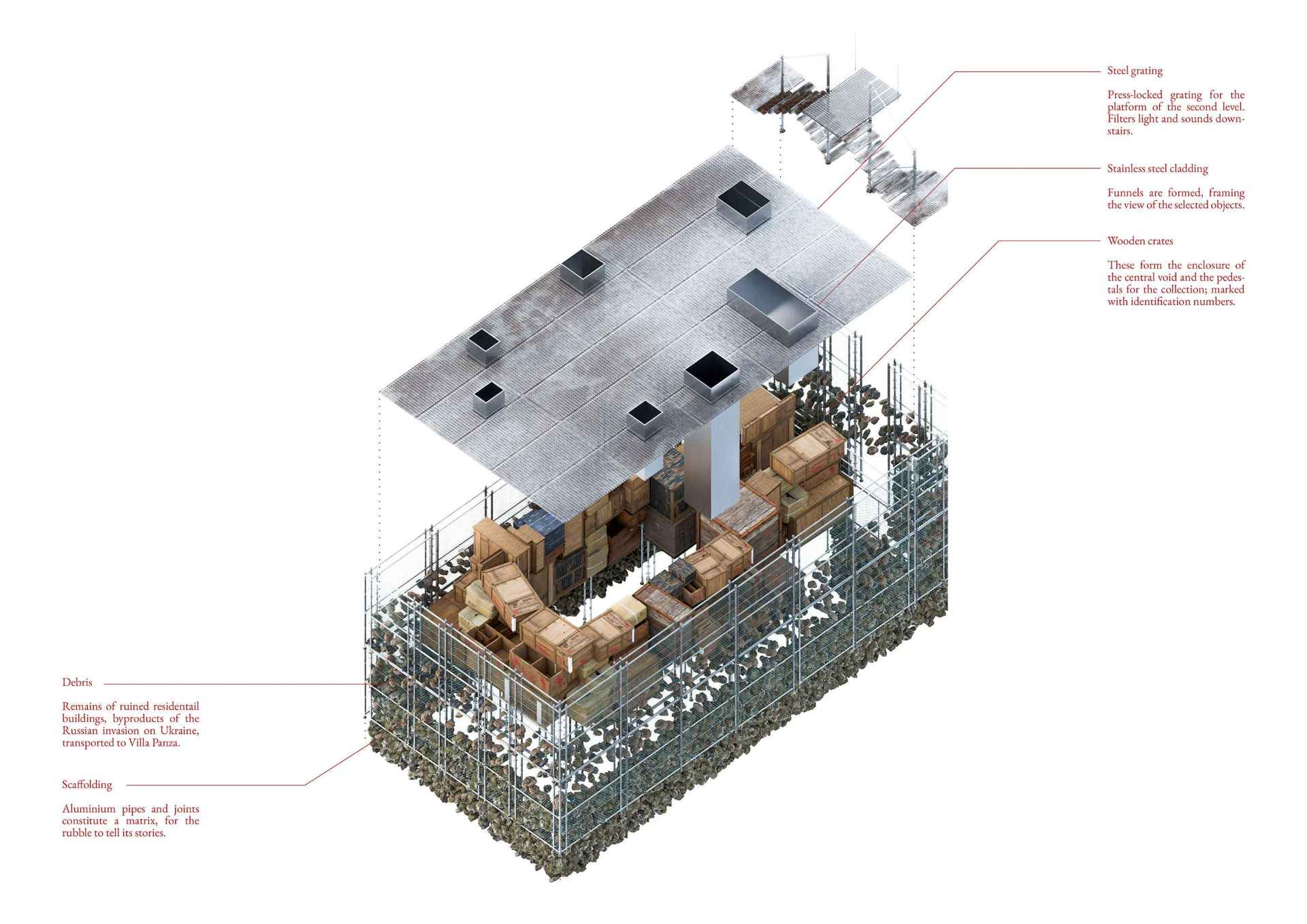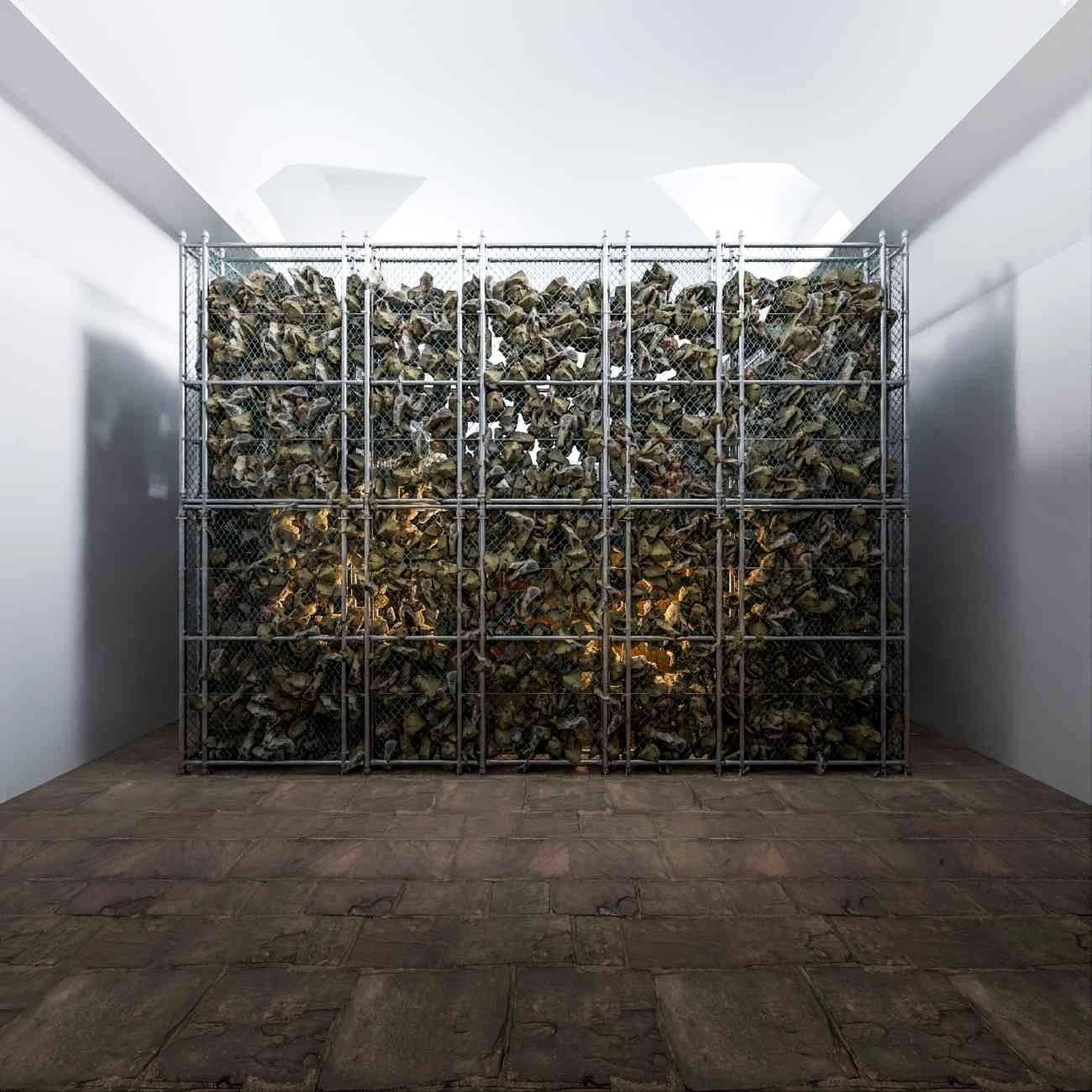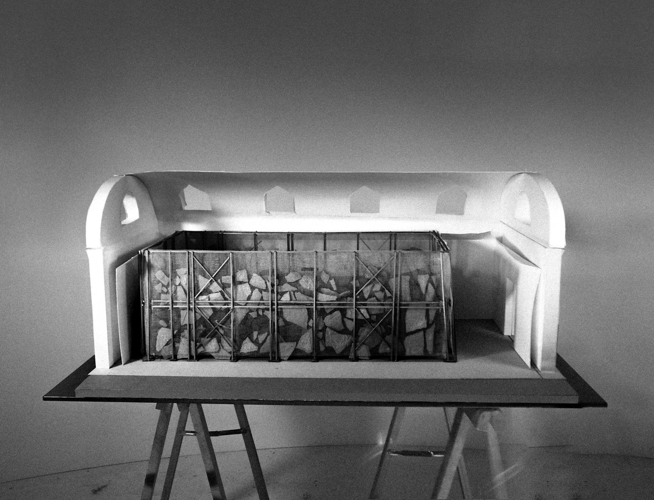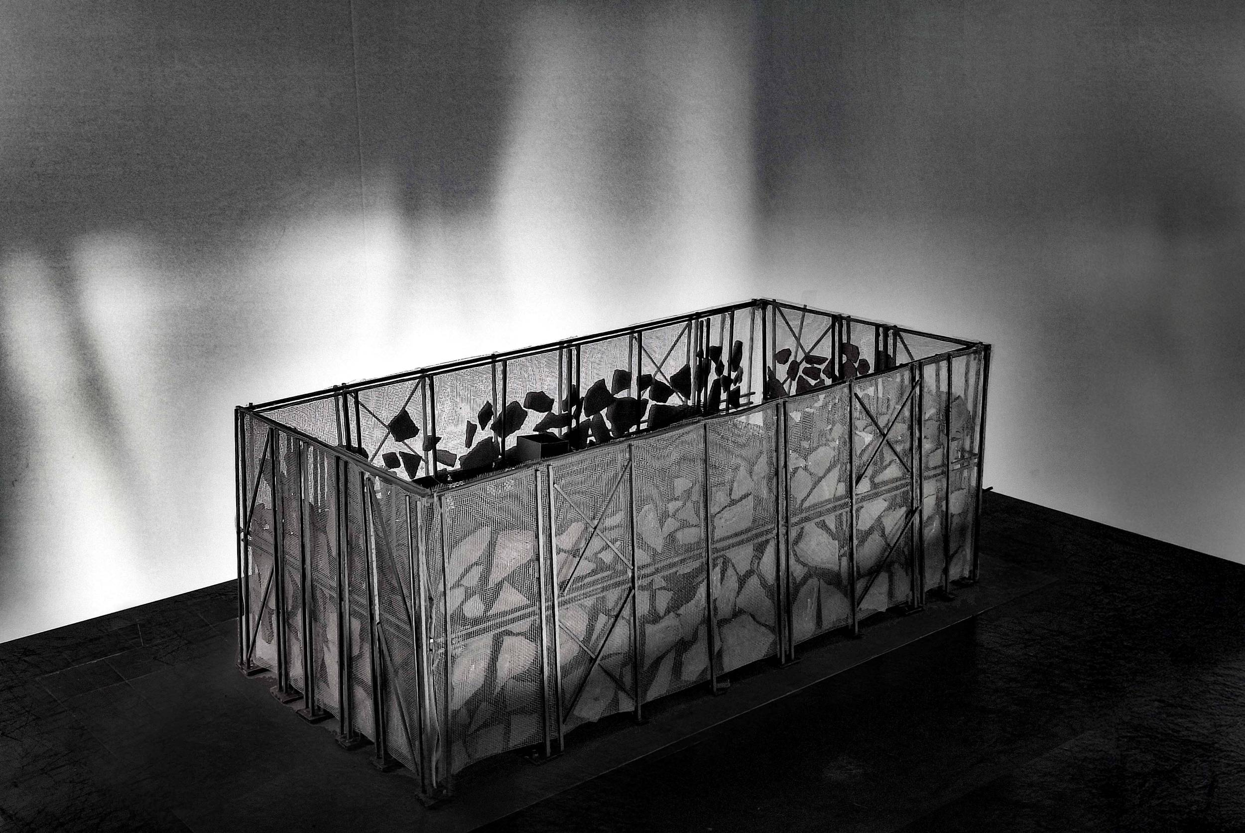 Designed as a temporary insertion in the Villa Panza Gallery, this exhibition explores how the violent destruction of buildings alters the value of the objects within. The exhibition reassembles debris from various natural disasters & warzones within five-meter-high walls of scaffolding and steel-wire-mesh.