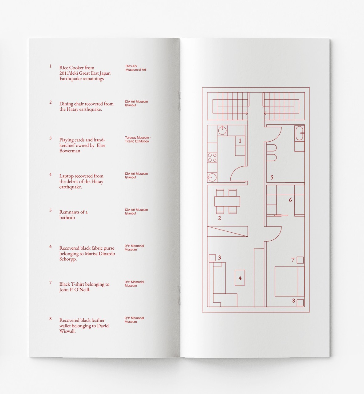 Within this volume, the exhibition is split into two: an inner void, and an upper floor. A collection of items is displayed: artifacts of quotidian life recovered from the rubble of natural disasters and warzones. Among them is a rice-cooker, a wallet, a laptop.